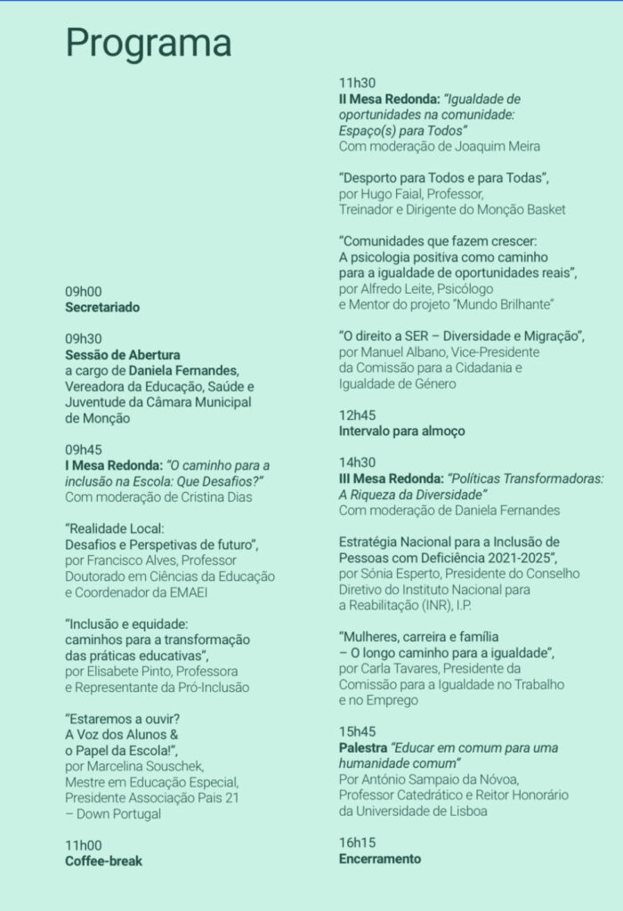 No período da manhã, realizaram-se dois painéis, um focado em “O caminho para a inclusão na Escola: Que Desafios?” com a participação da presidente da Pais 21, Marcelina Souschek, com o tema “Estaremos a ouvir? A voz dos alunos & o papel da escola!”. Outro painel focado na “Igualdade de oportunidades na comunidade: Espaço(s) para Todos”. À tarde, decorreu o terceiro painel, abordando “Políticas Transformadoras: A Riqueza da Diversidade”.